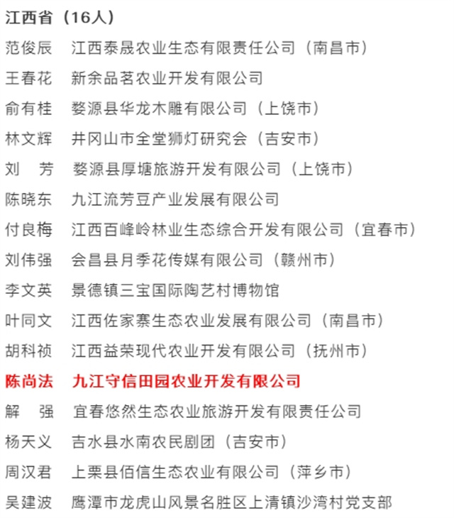 近日,文化和旅游領域傳來喜訊!根據《文化和旅游部辦公廳關于印發2024年度鄉村文化和旅游帶頭人支持項目入選人員和資助人員名單的通知》,在各地文化和旅游行政部門積極推薦的基礎上,經過嚴格的資格復核、評審以及公示等程序,全國共有468人成為2024年度鄉村文化和旅游帶頭人支持項目入選人員,九江守信田園農業開發有限公司陳尚法光榮在列!
